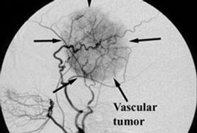Pictures of the blood vessels are taken and if appropriate a glue type material is then injected into the feeding blood vessels to reduce the flow of blood to the tumor.